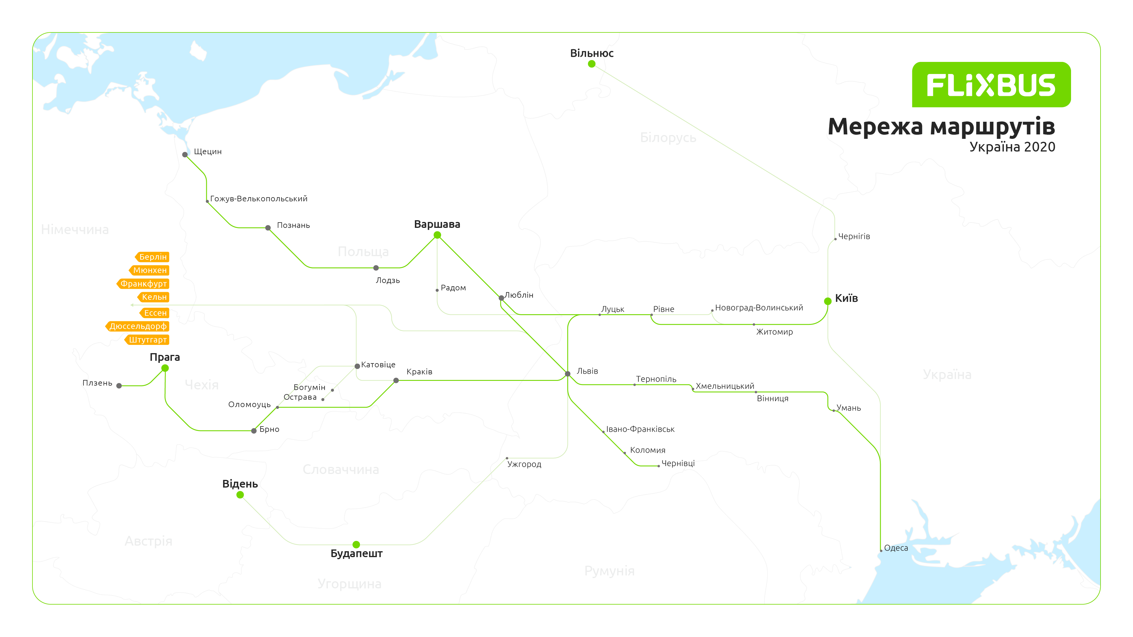 - FlixBus у грудні 2019 року назвав перший український маршрут, на якому працюватимуть автобуси компанії, — з Одеси до Пльзеня (Чехія).