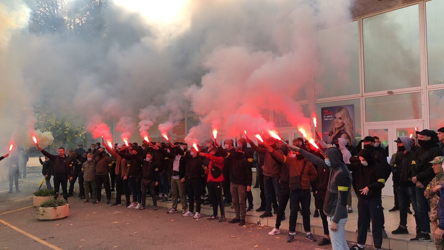 Представники «Нацкорпусу» заблокували вхід до холу та не впускали нікого всередину. Вони тримали в руках плакати з написами «Стус прийде за тобою», «Чемодан – вокзал – Росія» та «ОПзЖ = смерть». Під будівлею чергували близько 50 представників поліції та Нацгвардії.