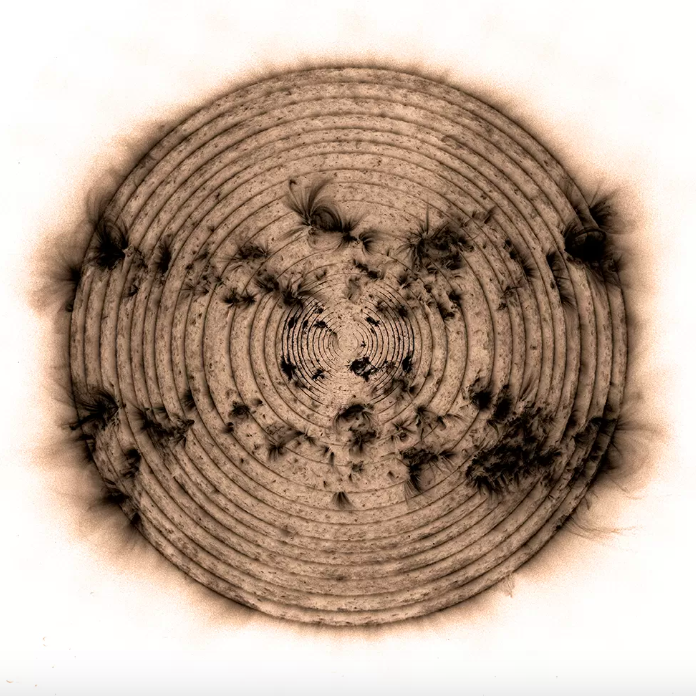 А це зображення об’єднало знімки, зроблені великими телескопами. Воно показує, як Сонце змінюється з часом — як дерево з кільцями. Автор цього фото Полін Вуллі отримала приз за інноваційність.