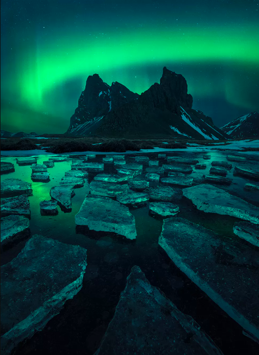 Відображення північного сяйва на вкритому льодом ісландському озері над горою Ейстрагорн. Цю фотографію зробив словацький фотограф Філіп Гребенди.