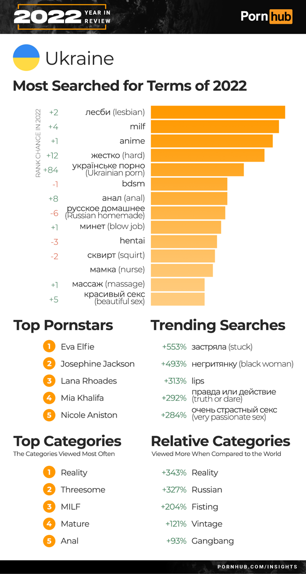У 2021 році найпопулярнішим пошуковим запитом в Україні був «російське домашнє», але після повномасштабного вторгнення цей запит втратив 6 позицій. Натомість «українське порно» підвищилося в рейтингу на 84 позиції.