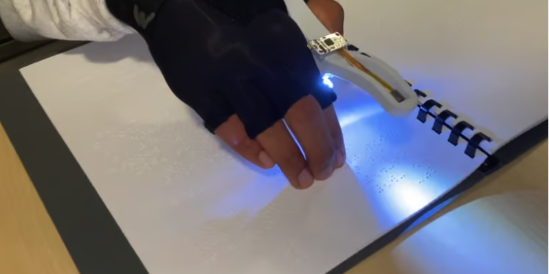 Візерунок висококонтрастних тіней відображається на камері, що дозволяє програмному забезпеченню на основі штучного інтелекту зіставляти цей шаблон зі шрифтом Брайля. Потім голосова система озвучує користувачеві, який це символ.