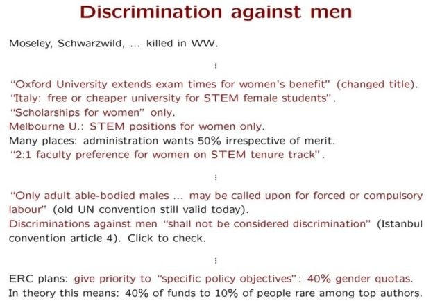 Более того, Струмия представил результаты другого исследования — касательно того, как часто женщинам отдают предпочтение в сфере науки. «Оксфордский университет продолжает время экзаменов для женщин, Италия предлагает бесплатное или более дешевое обучение в университете для женщин-ученых». Струмия пожаловался, что сам однажды не смог получить работу из-за того, что ее отдали женщине. Несмотря на то, что, как заявил профессор, он считал себя более квалифицированным.