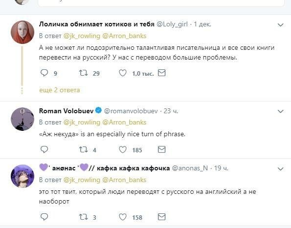 Ответ бизнесмену Роулинг написала на русском языке, намекнув на возможные связи Бэнкса с российским бизнесом (о которых неоднократно писали СМИ).