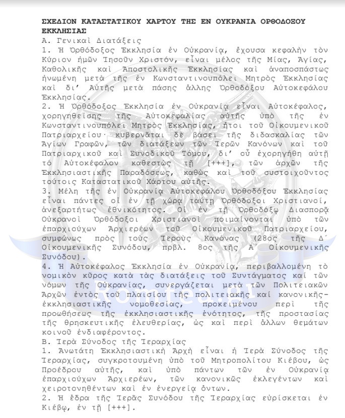 Одна из страниц устава опубликована на сайте агентства. В документе также идет речь о том, что мирра должна поступать только из Константинополя, и ставропигию (статус, присваиваемый православным монастырям, лаврам и братствам, а также соборам и духовным школам, который! делает их независимыми от местной епархиальной власти) также может только Константинополь.