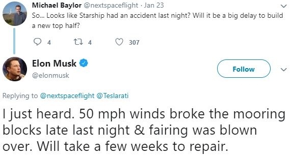 Информацию об инциденте подтвердил Илон Маск в комментарии к одному из твитов. Маск сообщил, что на ремонт ракеты потребуется несколько недель.