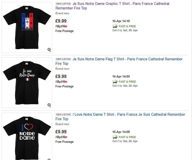 На интернет-аукционе eBay с 16 апреля начали появляться объявления о продаже фрагментов собора Парижской Богоматери, которые были вынесены после пожара. Как пишет Daily Mail, некоторые люди начали размещать объявления о продаже угольков, фрагментов и частей сгоревшего памятника культуры, а некоторые решили продавать футболки с изображением собора и надписями в стиле «Я люблю Нотр-Дам».