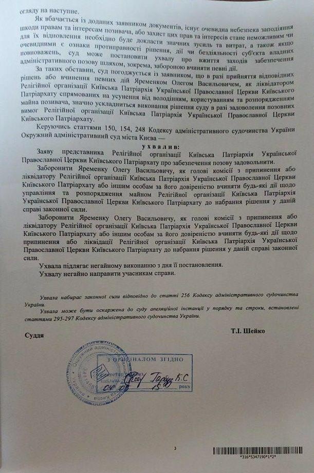 - 16 июля Окружной административный суд Киева возбудил дело по иску Украинской православной церкви Киевского патриархата (УПЦ КП) к Министерству культуры об отмене приказа о ликвидации религиозной организации.