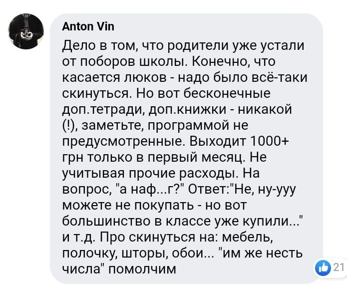 «Цена одного люка — 500 гривен. Спрашиваю, а что, родители не могут скинутся по 100 гривен и купить эти люки? Ужас в глазах — нет, они категорически против, мы еле заставили их купить в школу несколько десятков перегоревших лампочек», — пишет депутат.