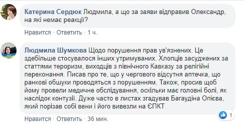 В комментарии родственница заключенного отметила, что те заявления Денисовой, о которых говорит в письме Шумков, касаются нарушения прав заключенных, удерживаемых на таких же условиях, как и Александр. Речь идет о выходцах с северного Кавказа, которых судят за терроризм и религиозные убеждения.