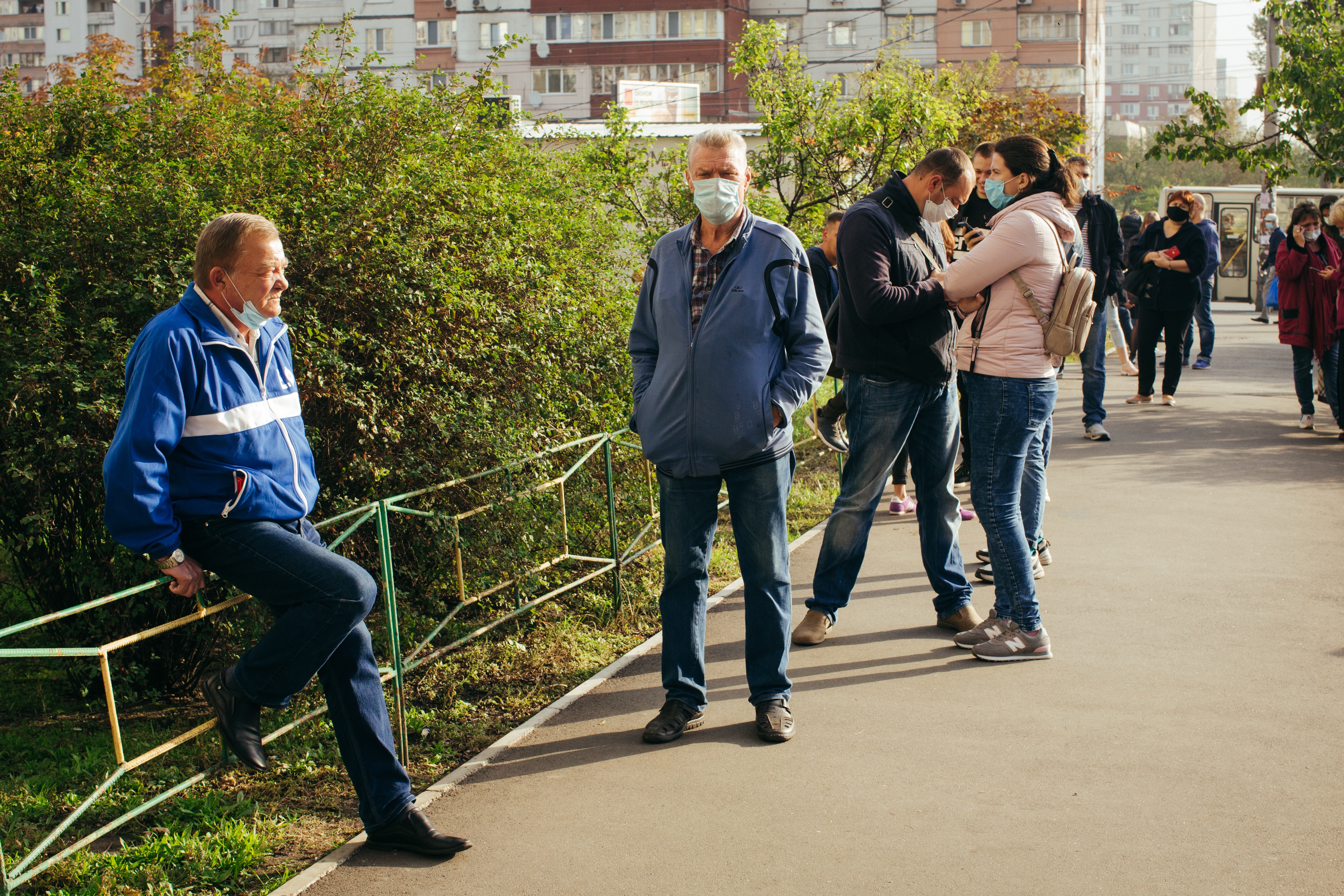 Журналистка уходит, компания продолжает смеяться. Парень объясняет свою позицию: мол, вирус может и есть, но заразиться трудно. Тест он делает, чтобы сняться с самоизоляции после возвращения из-за границы. Со скамейки в парке за компанией следит бабушка в малиновой жилетке и потертой одноразовой маске. Она заняла очередь сразу за молодежью без масок, но устала стоять.
