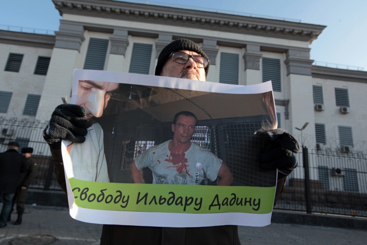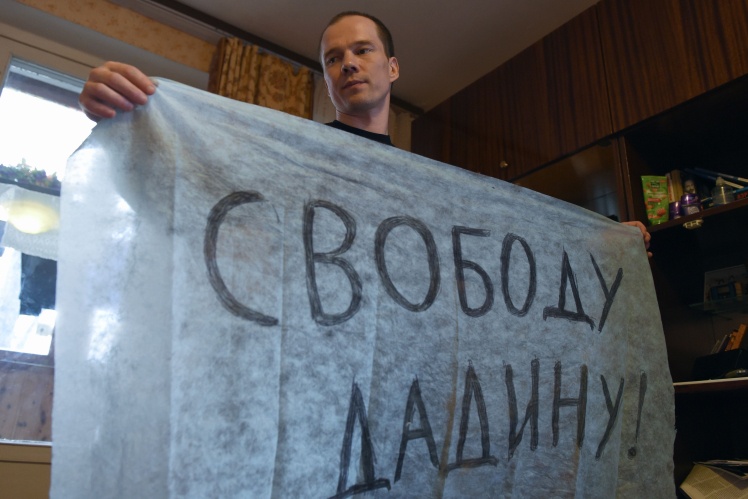 Протести під посольством Росії в Україні із закликами звільнити Дадіна, серпень 2016 року. Дадін після виходу з в'язниці, березень 2017 року.