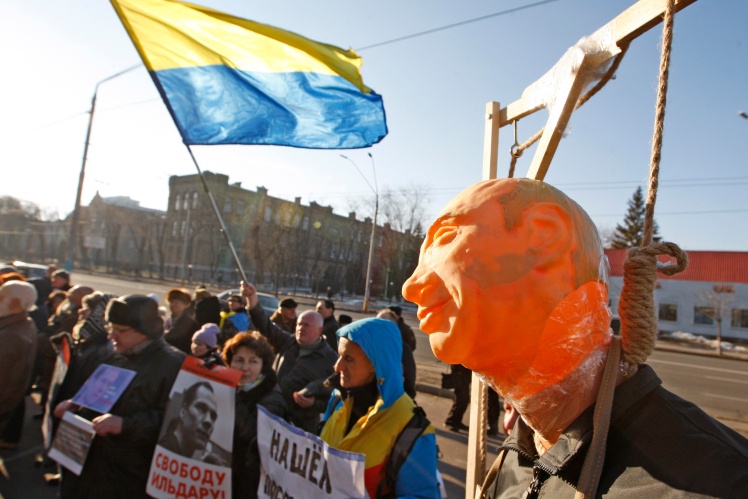 Ільдар Дадін (праворуч) та інші російські активісти під час акції протесту в центрі Москви з написом «Вчора — Київ, завтра — Москва», грудень 2014 року.