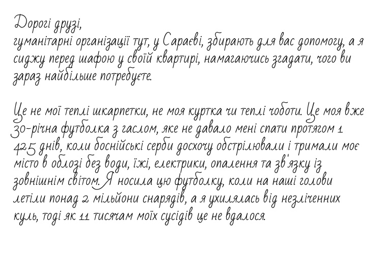 Знаєте, це може прозвучати дивно, але я сумую за атмосферою блокадного Сараєва. Там я усвідомила, що всі ці індивідуальні стратегії втечі й виживання не працюють. Єдиний спосіб вижити в надзвичайно складних умовах — залишатися разом. Поодинці у вас немає шансів. У Сараєві всі всім ділились. Уявіть, у місті, де все було дефіцитом, ми не замикали дверей. Бо коли починалась стрілянина, ті, хто опинився на вулиці, мали кудись швидко сховатись, часу стукати в двері у них не було. Люди просто забігали і лишались на день, два, три. Їм давали місце де спати, і так завʼязувалась дружба.