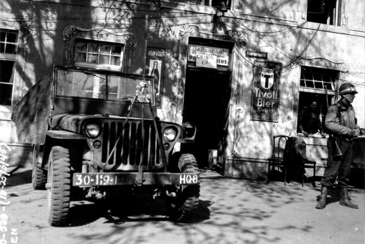 Фейковий штаб, облаштований «Армією привидів» в одному німецьких містечок, березень 1945 року. Фейковий блокпост справжньої дивізії, облаштований «Армією привидів» в одному німецьких містечок, березень 1945 року.