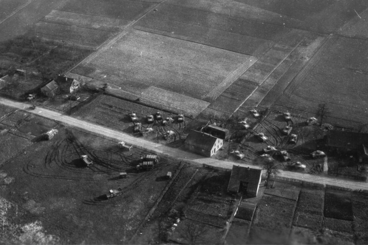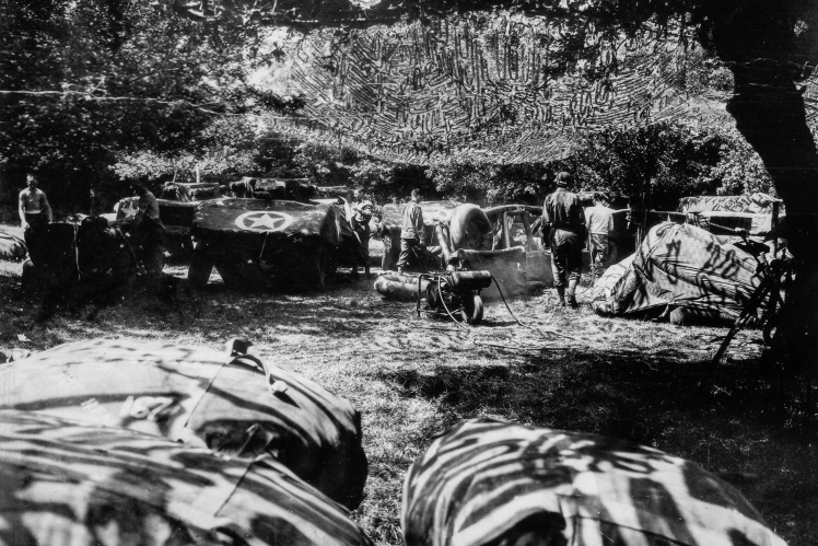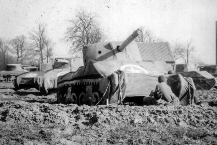 Фейковий військовий табір на березі Рейну, березень 1945 року. Надувні танки на позиціях біля фейкової переправи через Рейн, березень 1945 року.