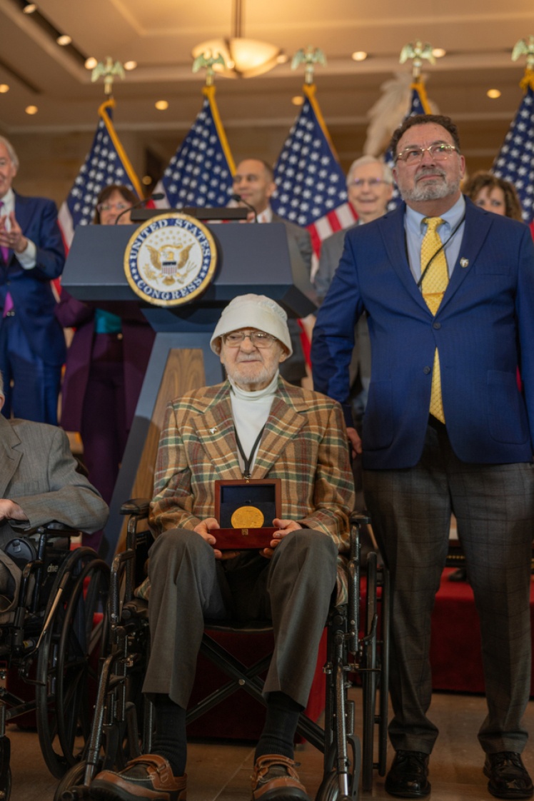 Берні Блуштейн (у світлому капелюсі) на церемонії нагородження Золотою медаллю Конгресу за службу в «Армії привидів», 2024 рік. Золота медаль Конгресу за службу в «Армії привидів», 2024 рік.