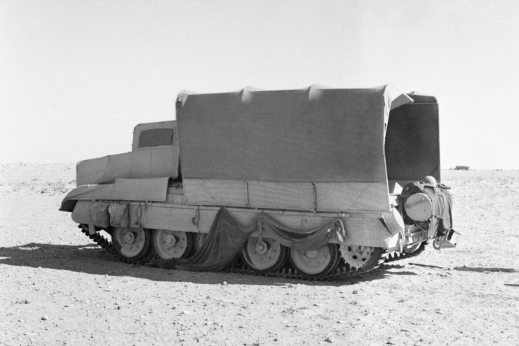 Макети танків, встановлені на вантажівках, пересуваються Північною Африкою, 1942 рік. Британський танк, замаскований під вантажівку, у Північній Африці, 1942 рік.