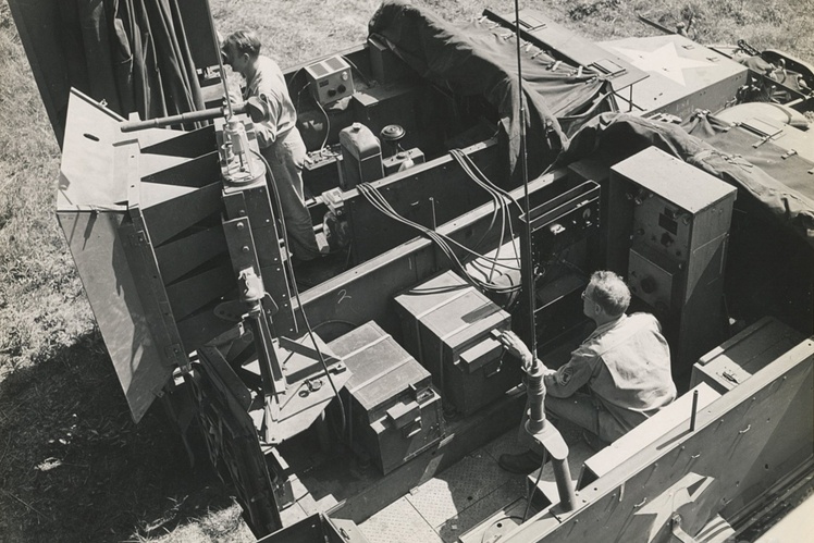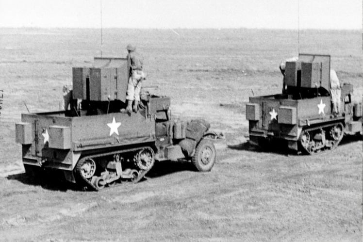 Тестування звукового обладнання «Армії привидів» на одній з американських баз, 1944 рік. Вантажівки з гучномовцями «Армії привидів» імітують діяльність справжніх підрозділів неподалік лінії фронту, 1944—1945 роки.