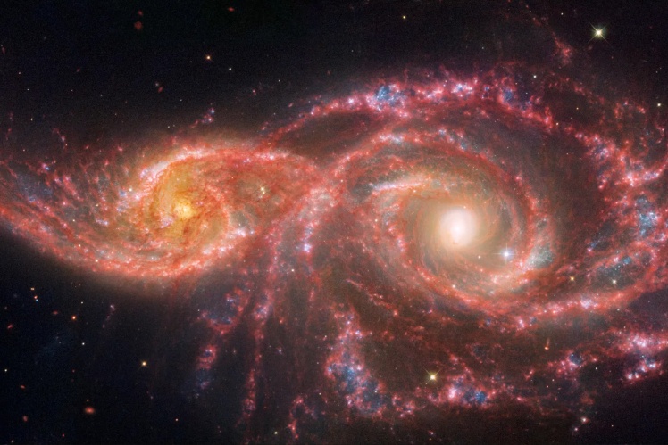 А ось такі фотографії далеких незвіданих галактик робить NASA завдяки своєму телескопу James Webb. Його запустили у 2021 році, і це — один з найважливіших проєктів у сфері астрономії у ХХІ столітті. На першому фото — «танець» двох галактик; на другому — галактики IC 2163 та NGC 2207, вони торкнулися одна одної мільйони років тому; на третьому — народження зірки.