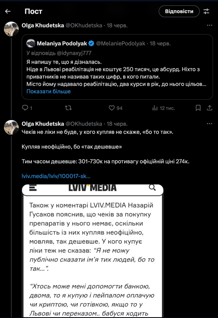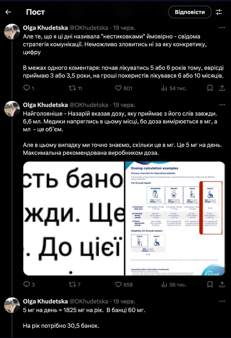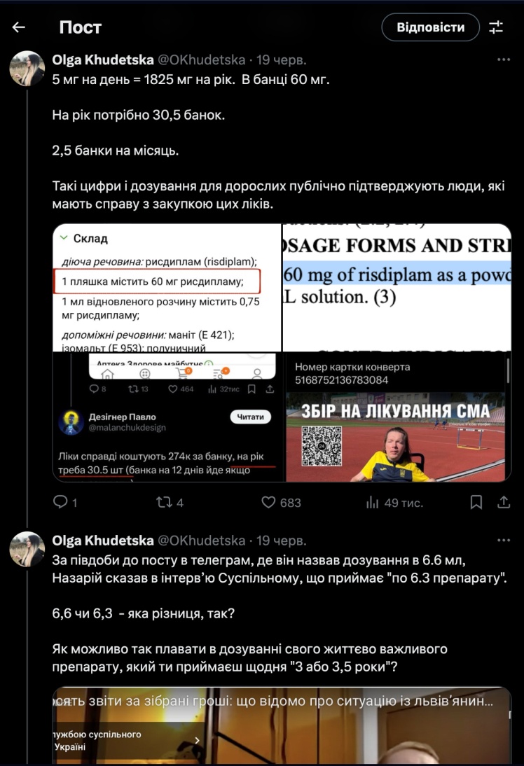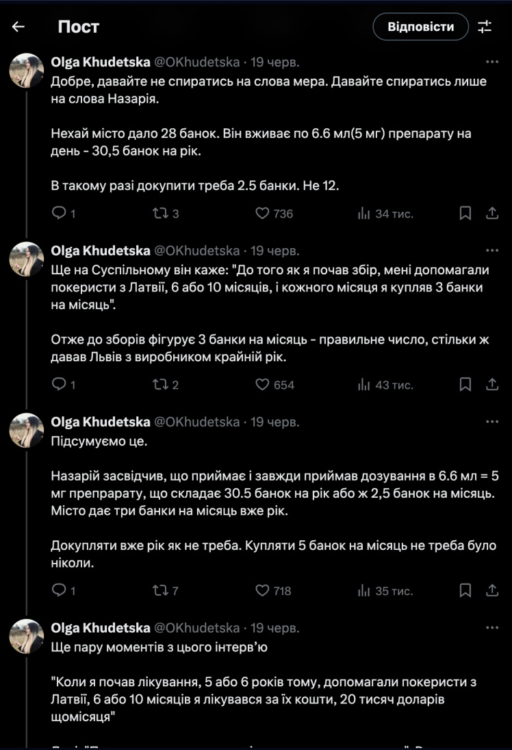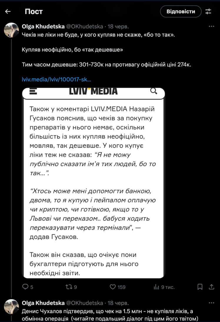 Так, у другій частині розслідування вже була математична перевірка заявлених дозувань ліків і зборів. Цього було достатньо, щоб зрозуміти, що потреби не відповідали реальності. Показово, що навіть на цьому етапі люди ще його захищали і перестали лише тоді, коли я опублікувала дані про нині вже померлу дівчину, яка була хвора на рак і у якої він витягав 500 тисяч гривень.