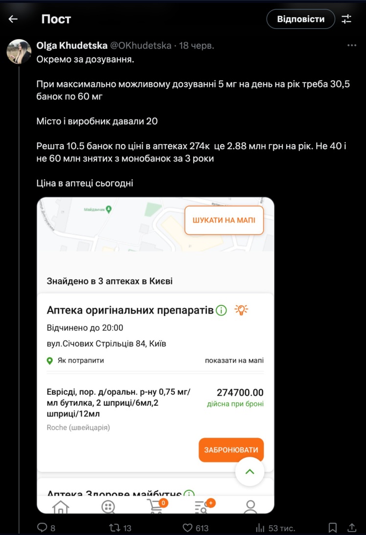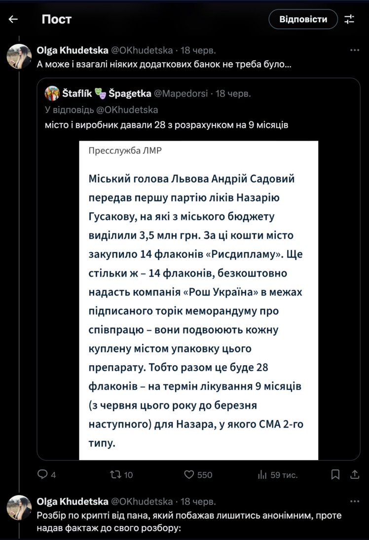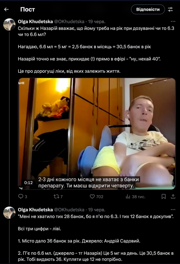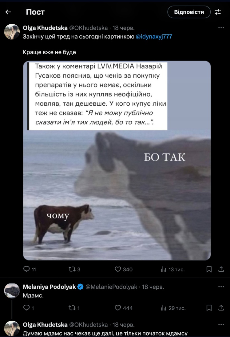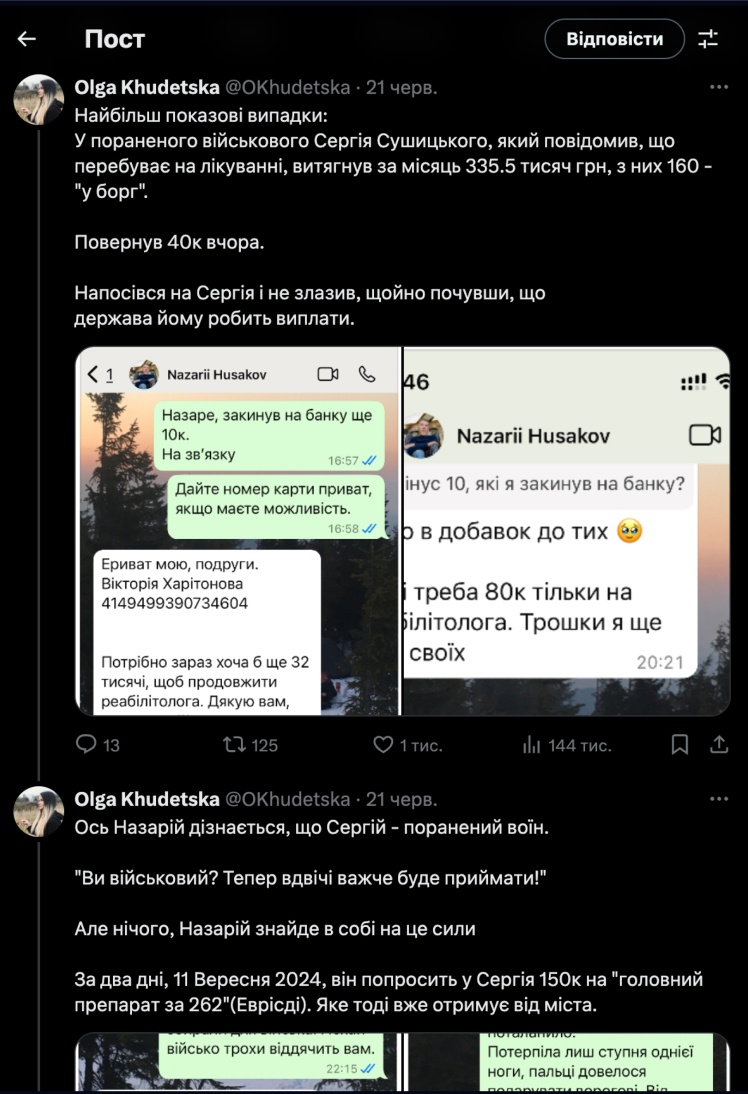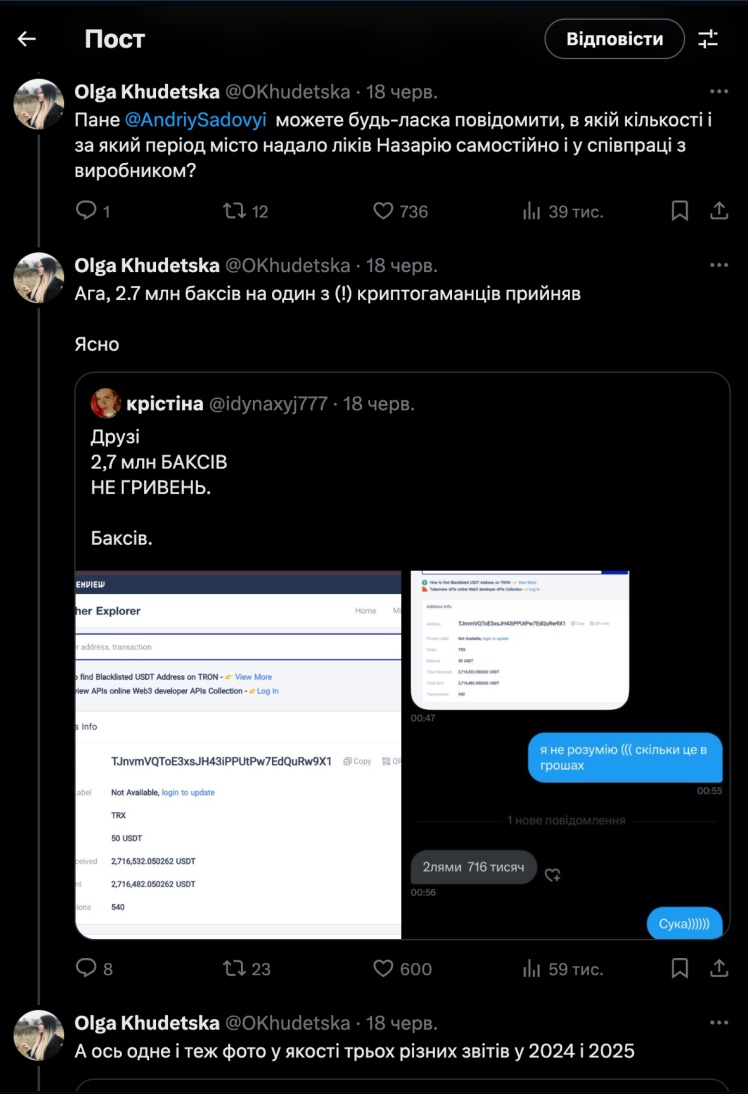 Так, у другій частині розслідування вже була математична перевірка заявлених дозувань ліків і зборів. Цього було достатньо, щоб зрозуміти, що потреби не відповідали реальності. Показово, що навіть на цьому етапі люди ще його захищали і перестали лише тоді, коли я опублікувала дані про нині вже померлу дівчину, яка була хвора на рак і у якої він витягав 500 тисяч гривень.