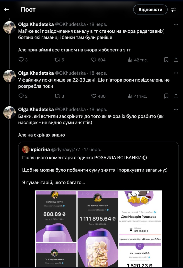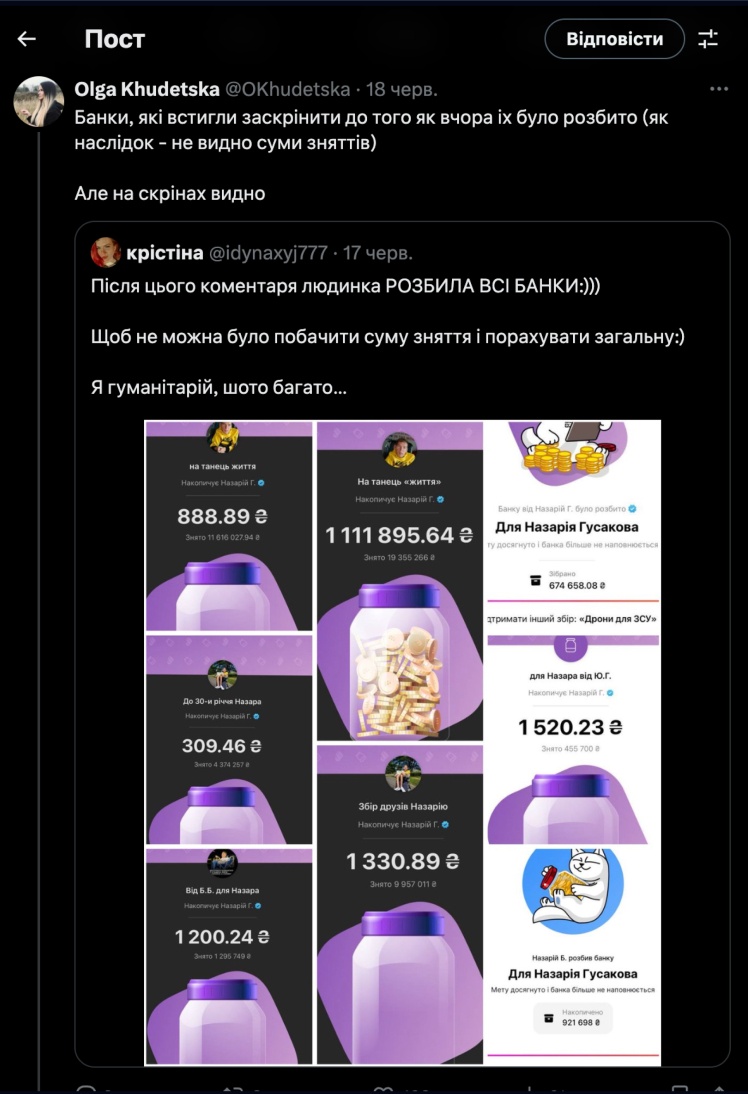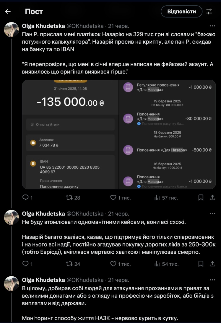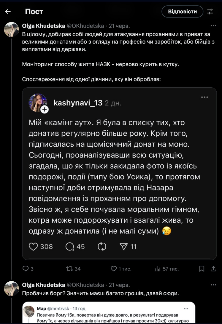 Першою це помітила дівчина Крістіна, але вона не вказала, про кого йдеться. Я бачила кілька її постів у X на кшталт «знайшла вже 40 мільйонів, знятих із банок без жодного звіту». Вона описувала ситуацію загалом, без імен, всі почали питати, про кого йдеться. Вона казала, що боїться навіть озвучити імʼя, бо її порвуть. Що це медійна особа. Було видно, що їй справді страшно. Я теж спитала, про кого мова, і вона приватно сказала, що це Назарій. І що всі, з ким вона про це говорила, радили не чіпати його, бо він буде жорстко медійно реагувати.