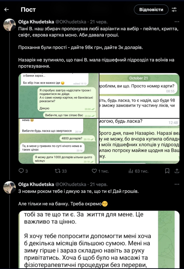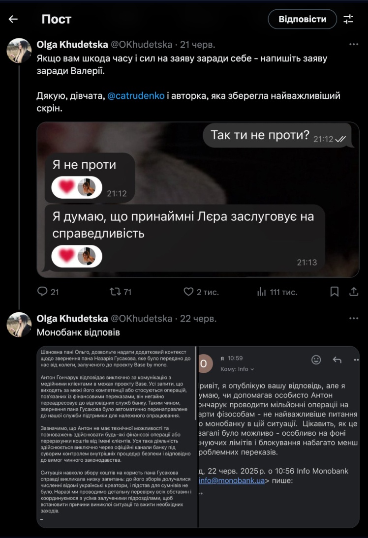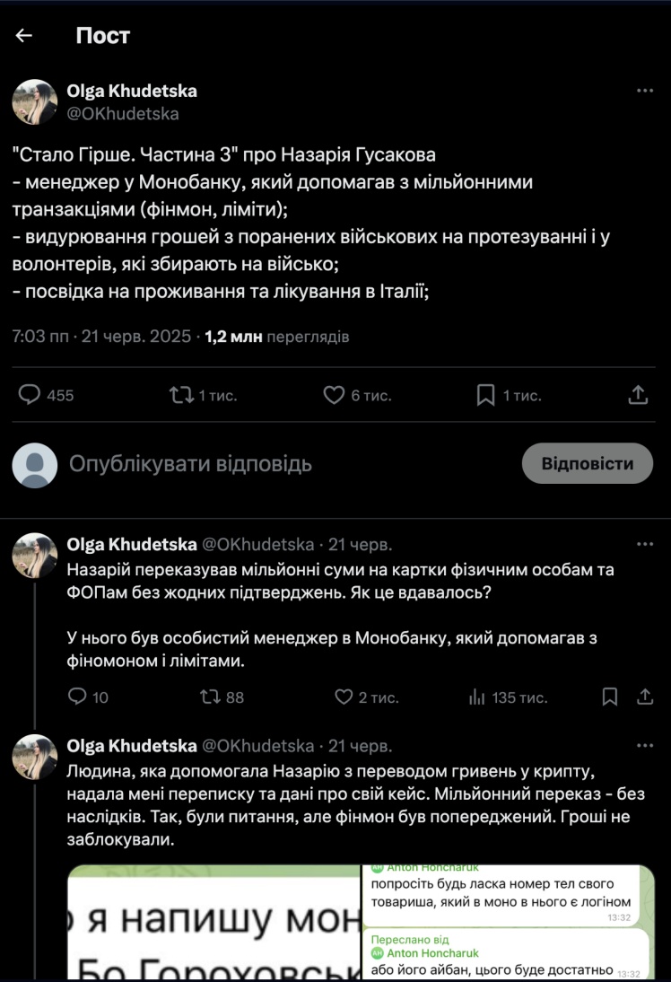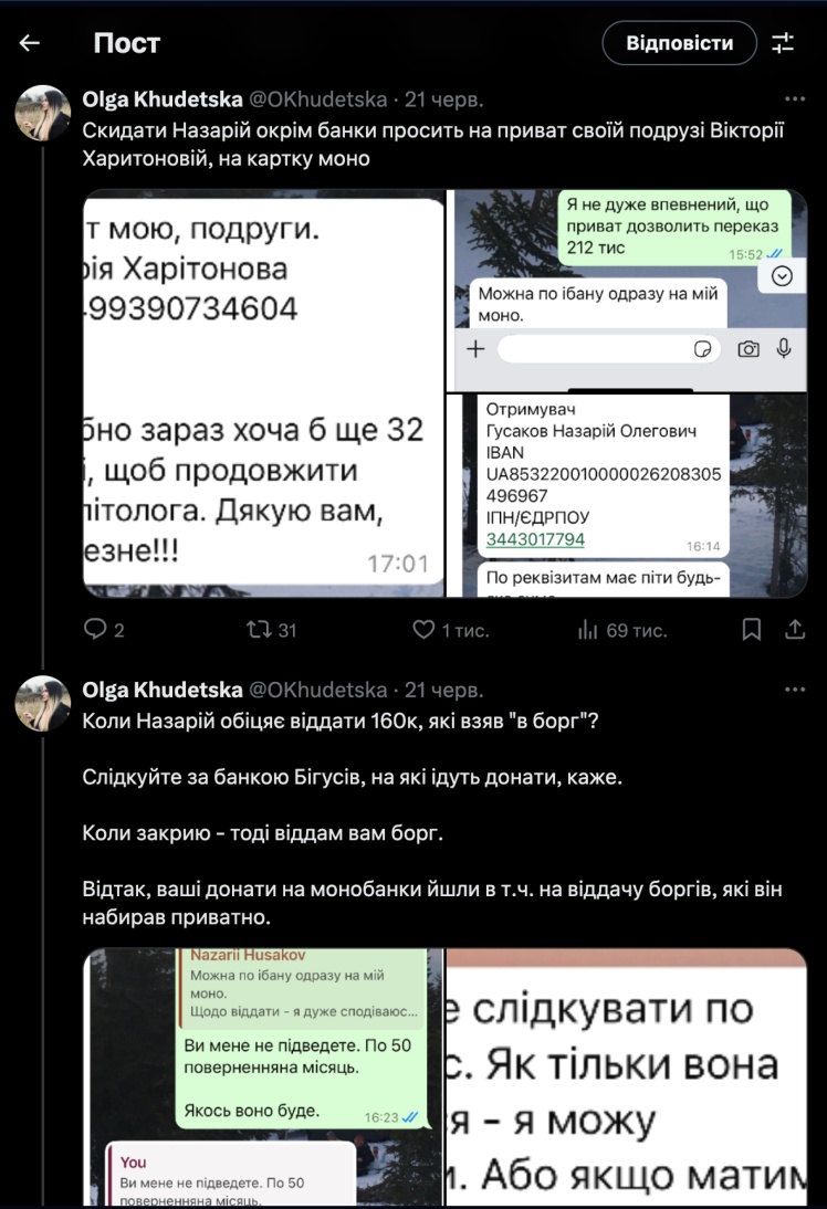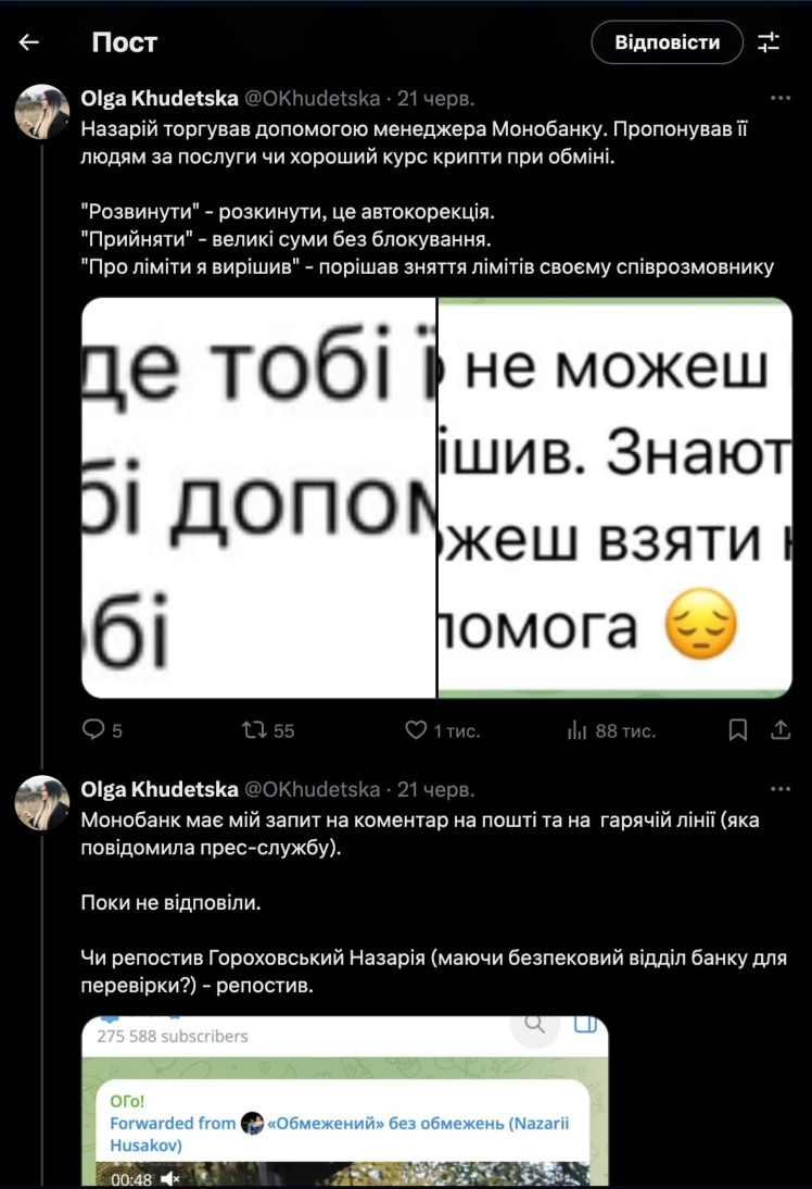 Першою це помітила дівчина Крістіна, але вона не вказала, про кого йдеться. Я бачила кілька її постів у X на кшталт «знайшла вже 40 мільйонів, знятих із банок без жодного звіту». Вона описувала ситуацію загалом, без імен, всі почали питати, про кого йдеться. Вона казала, що боїться навіть озвучити імʼя, бо її порвуть. Що це медійна особа. Було видно, що їй справді страшно. Я теж спитала, про кого мова, і вона приватно сказала, що це Назарій. І що всі, з ким вона про це говорила, радили не чіпати його, бо він буде жорстко медійно реагувати.