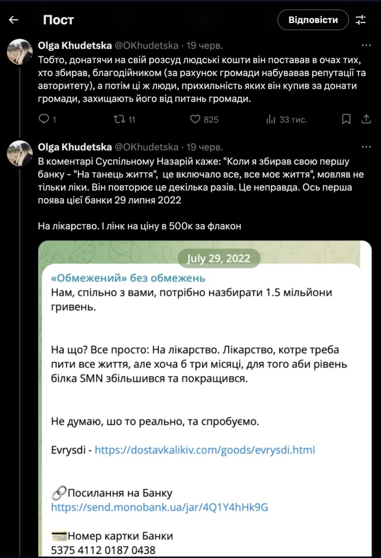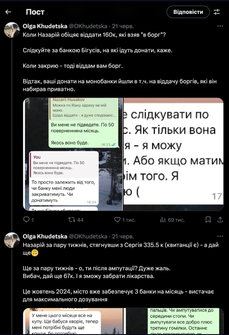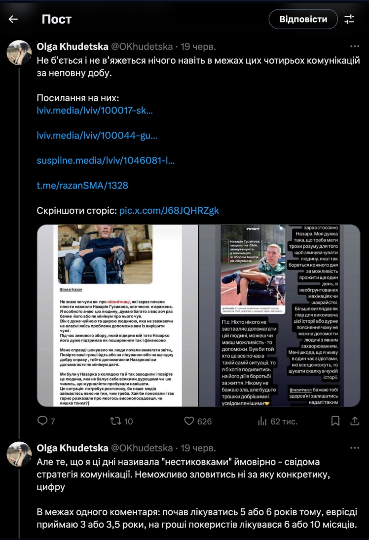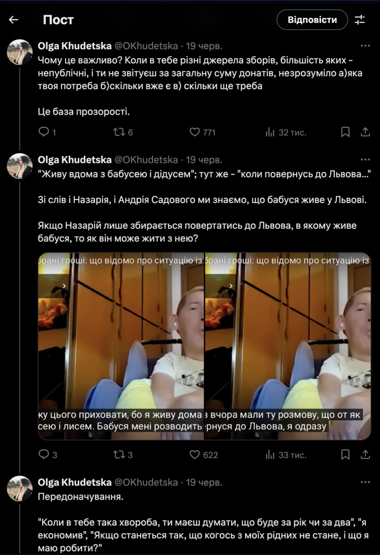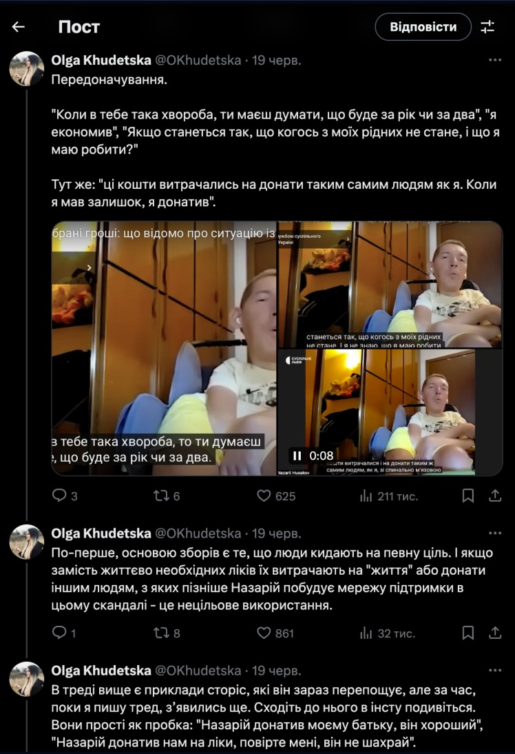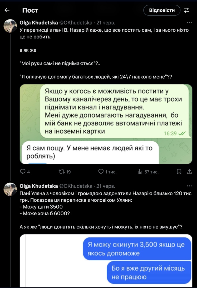 Я ще встигла заархівувати його телеграм-канал до того, як він його закрив і видалив 23 червня, а в сторіз почав публічно репостити чужі публікації про те, що обурливо вимагати з Назарія звіти. Його основний меседж був: «Як ви взагалі можете вимагати звітів від людини з інвалідністю, з важкою хворобою?». Паралельно дівчата теж розкручували цю історію.