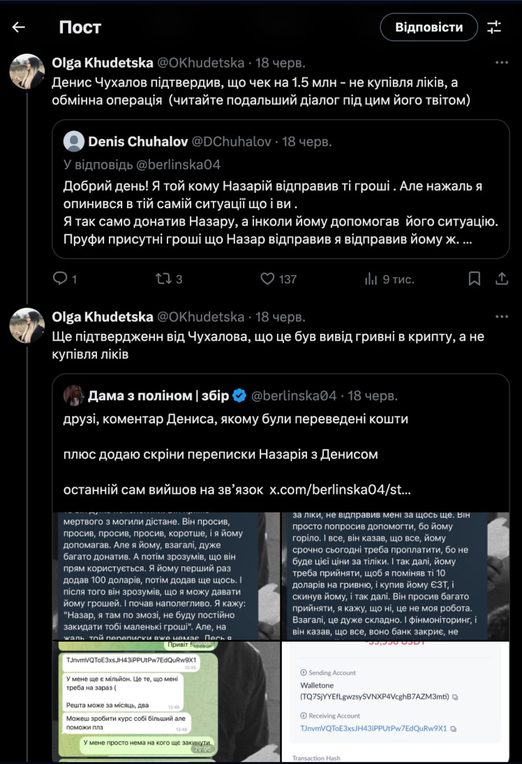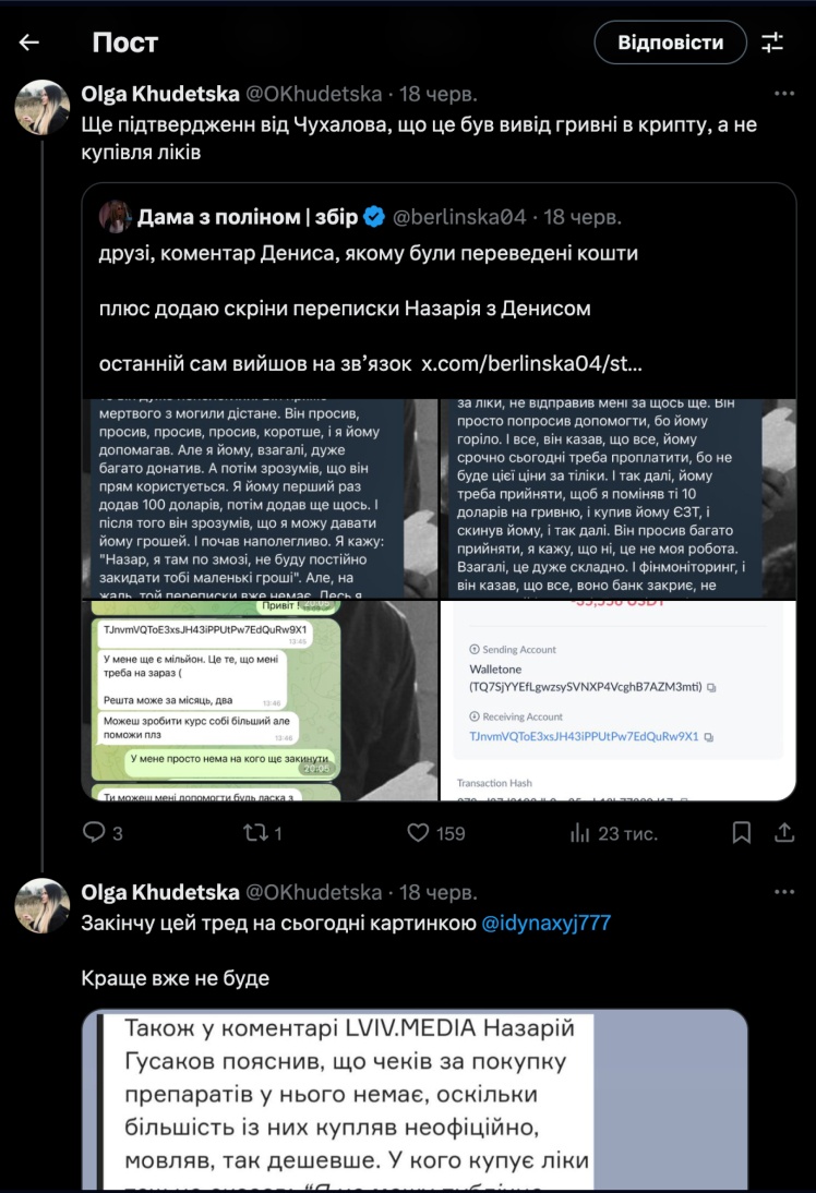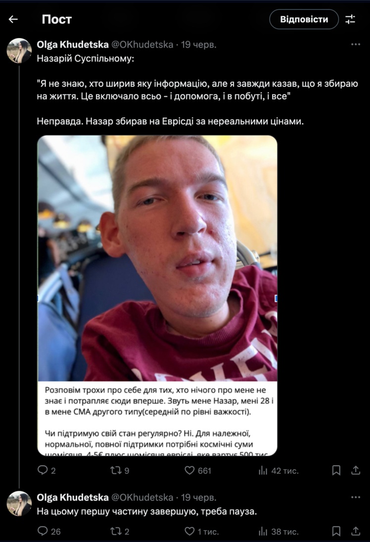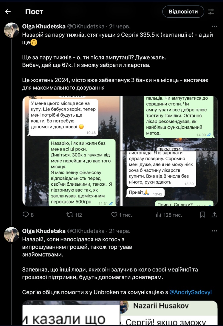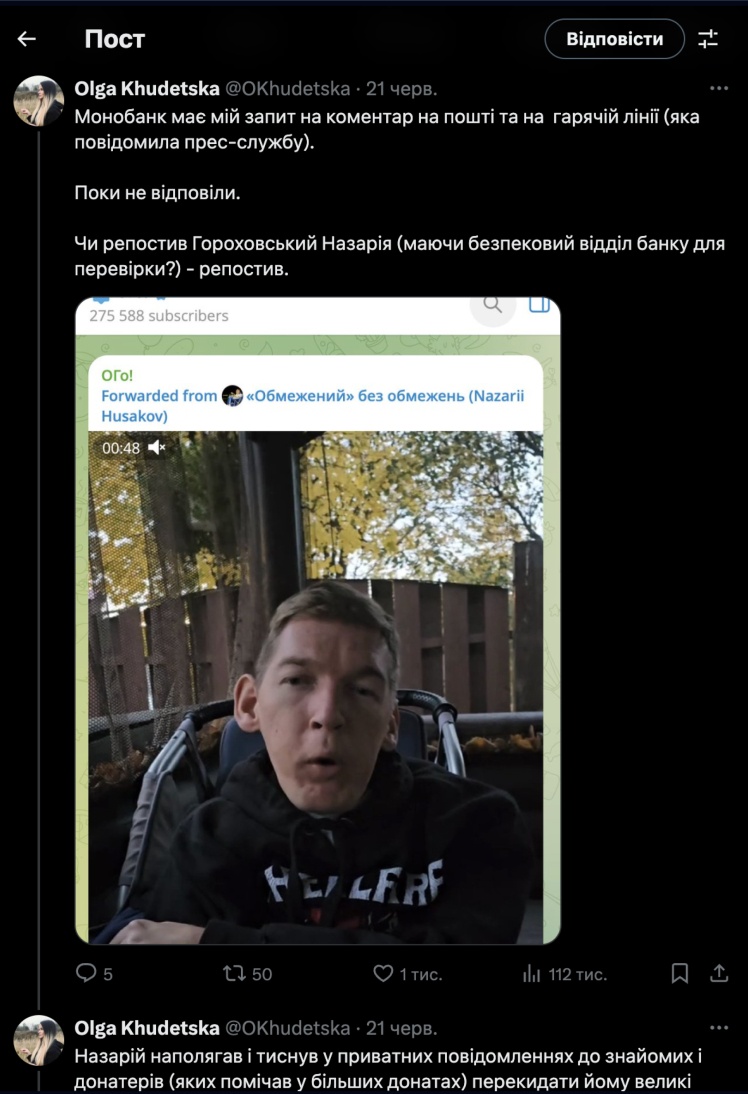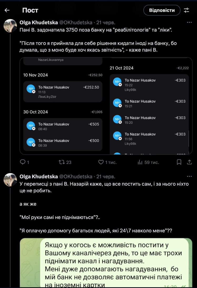 Я ще встигла заархівувати його телеграм-канал до того, як він його закрив і видалив 23 червня, а в сторіз почав публічно репостити чужі публікації про те, що обурливо вимагати з Назарія звіти. Його основний меседж був: «Як ви взагалі можете вимагати звітів від людини з інвалідністю, з важкою хворобою?». Паралельно дівчата теж розкручували цю історію.