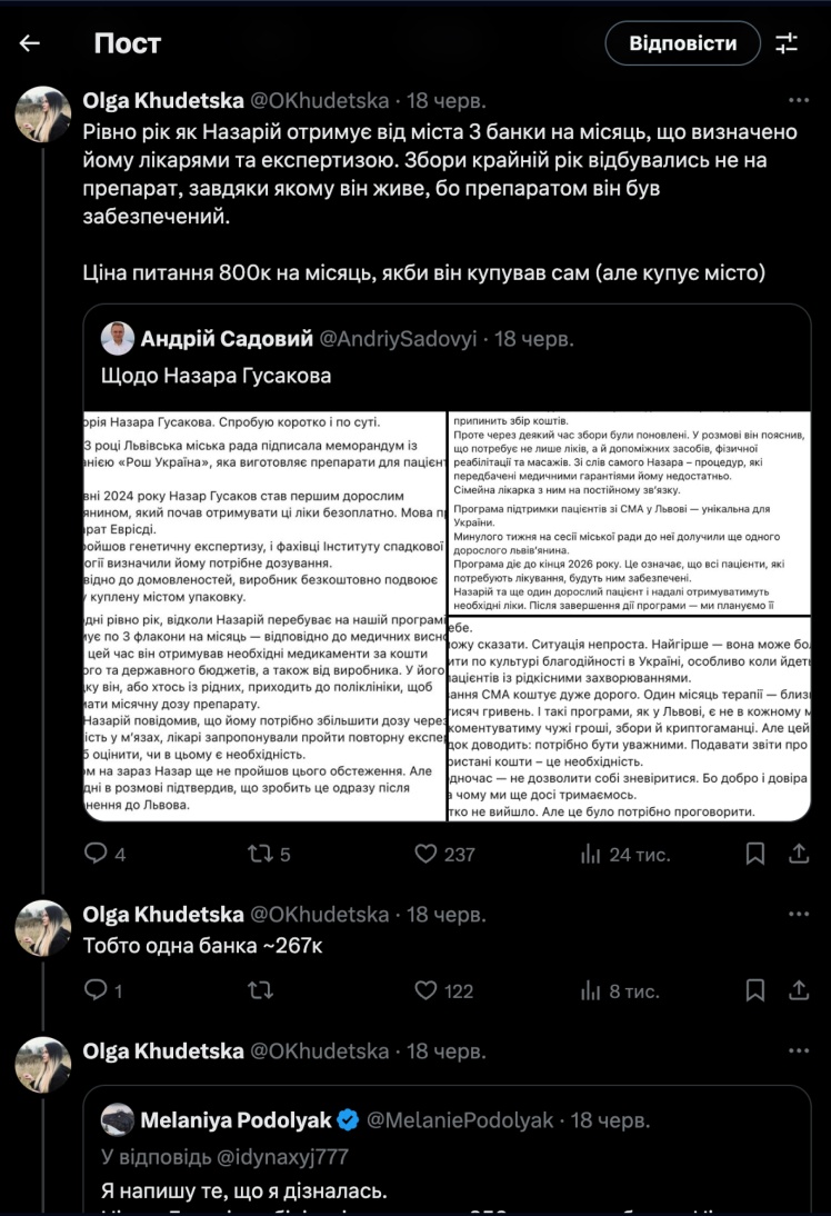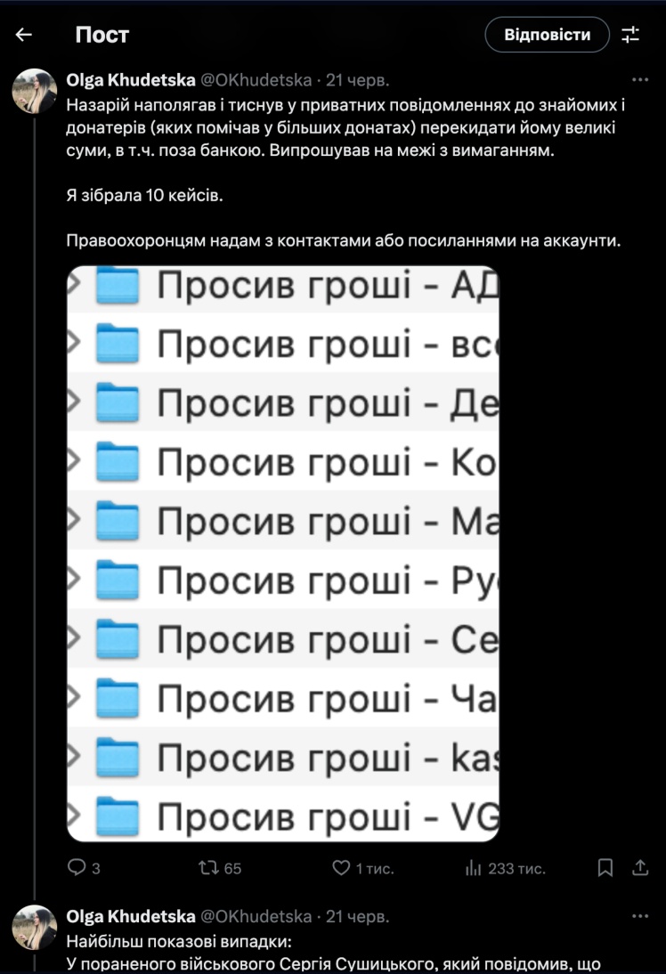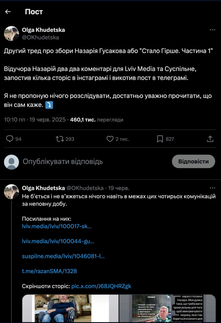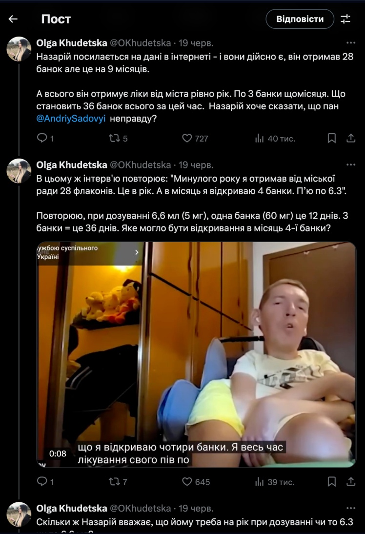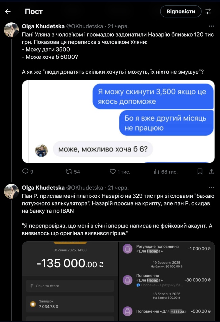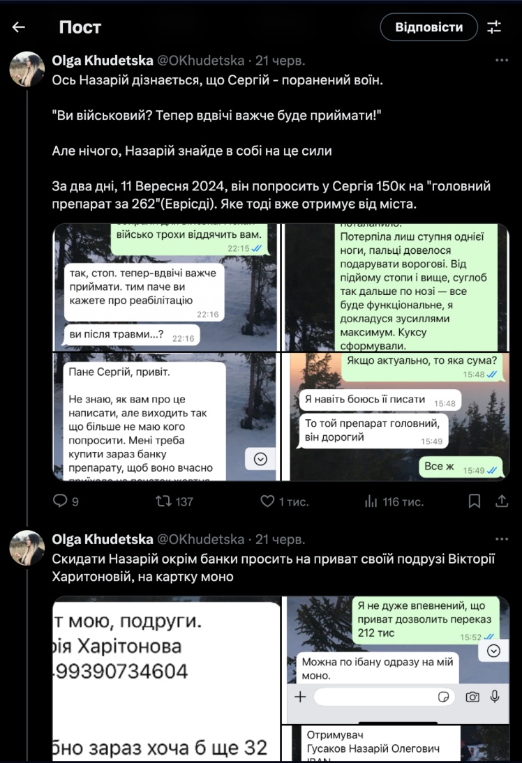Я ще встигла заархівувати його телеграм-канал до того, як він його закрив і видалив 23 червня, а в сторіз почав публічно репостити чужі публікації про те, що обурливо вимагати з Назарія звіти. Його основний меседж був: «Як ви взагалі можете вимагати звітів від людини з інвалідністю, з важкою хворобою?». Паралельно дівчата теж розкручували цю історію.