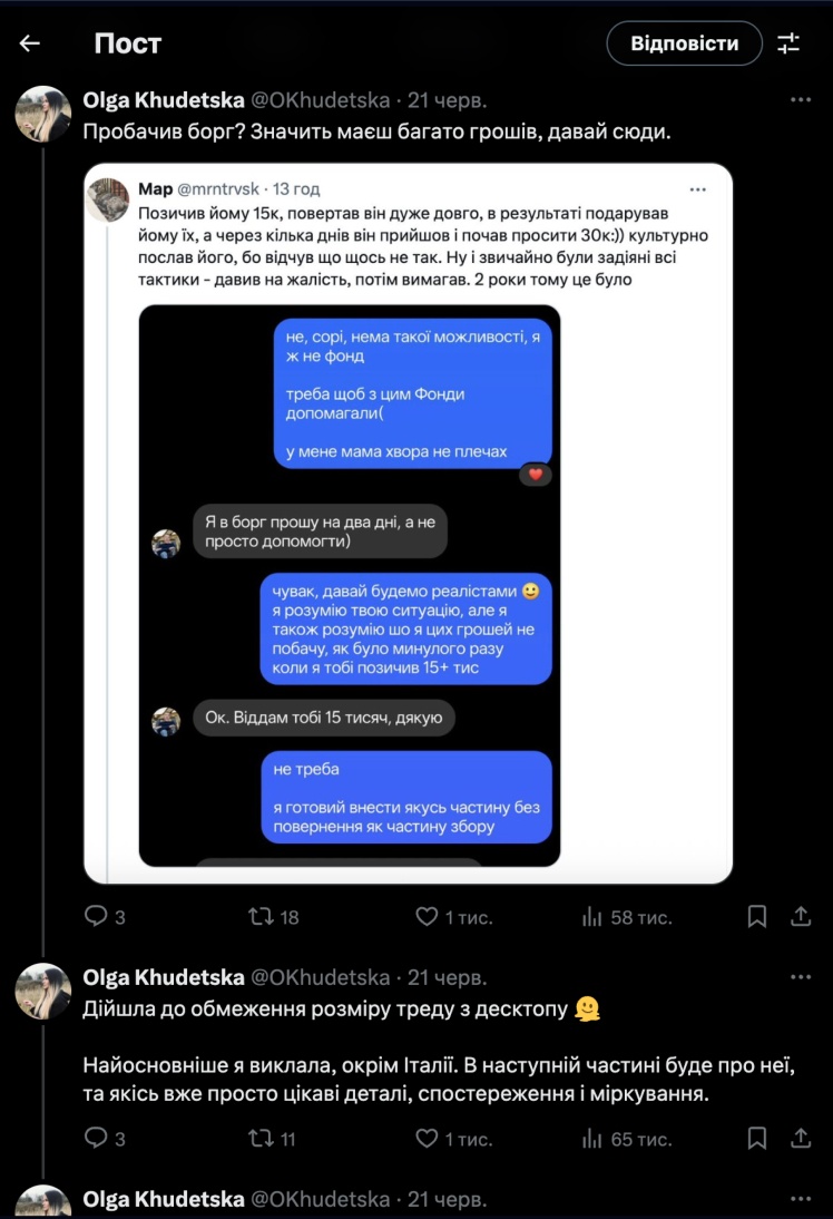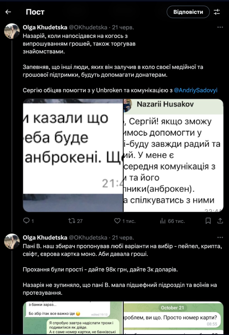 Так, але це звернення було радше винятком, масово люди ще не писали. Перед тим як мені написати, Сергій заархівував свій чат з Назарієм, написав йому і навіть повернув 40 тисяч гривень.