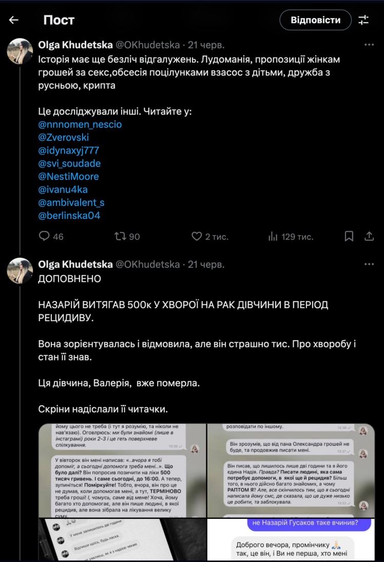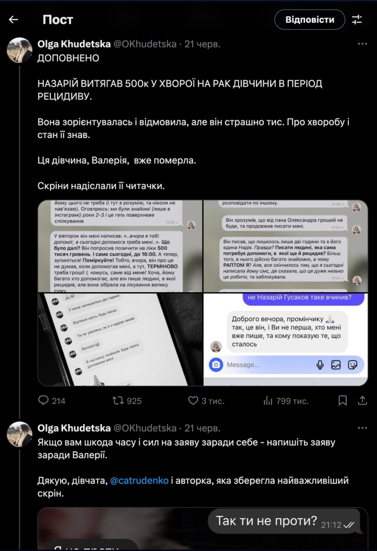 Коли вона ще була жива, вона ділилася цим у своєму інстаграмі, але не називала імен. Подруга моєї читачки написала їй у приват і спитала, чи про Назарія мова. Вона підтвердила, і цю переписку зберегли. Зі мною поділилися цими скринами, дозволили опублікувати.