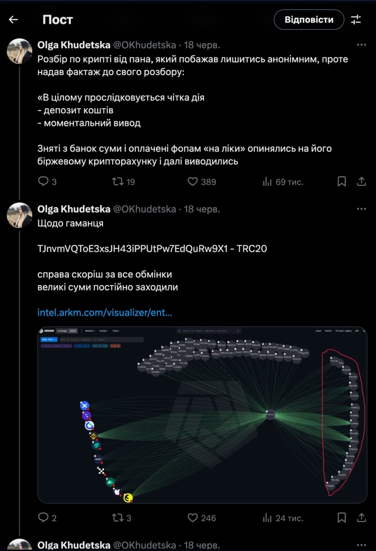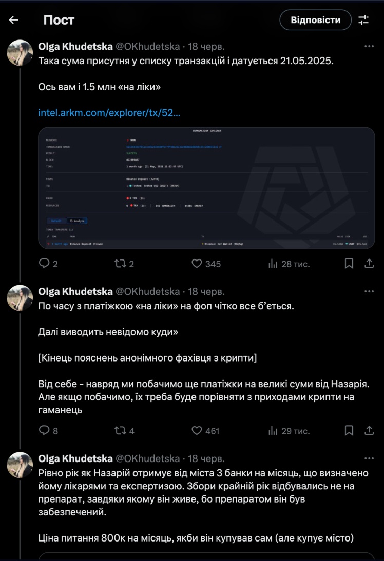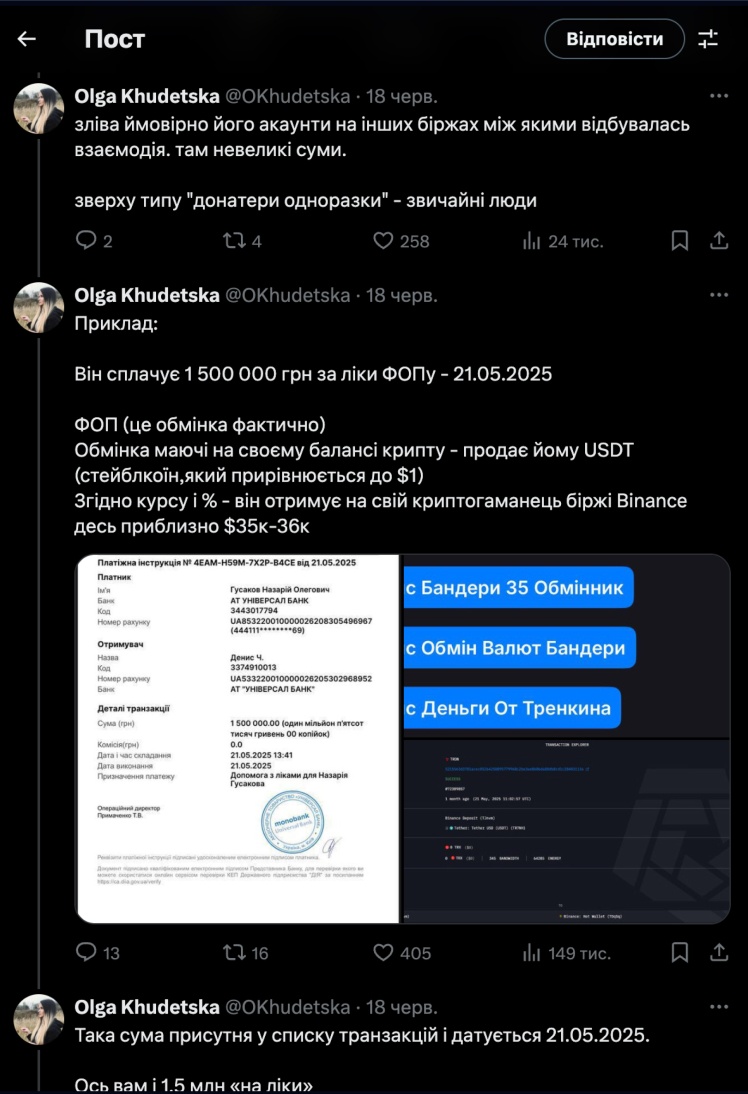 Наш аналітик показав, що більшість операцій на одному з криптогаманців Назарія — це транзакції від обмінників. Були поодинокі донати від простих людей, але вони виглядали радше випадковими. Далі гроші виводилися з гаманця Назарія на Binance, а далі, як мені пояснили, відслідкувати перекази вже неможливо.