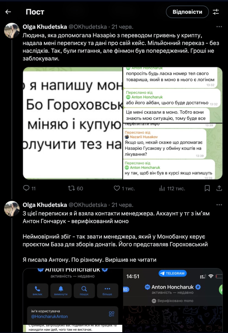 Моє припущення (саме припущення, а не факт): Гороховський звернувся до когось у банку з проханням допомогти з переказами і передав цю справу приватному менеджеру. Антон Гончарук, який займався переказами Назарія в Моно, можливо, лише перенаправляв питання далі. Тут є простір для припущень.