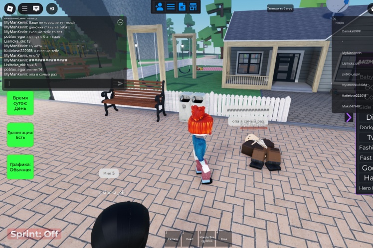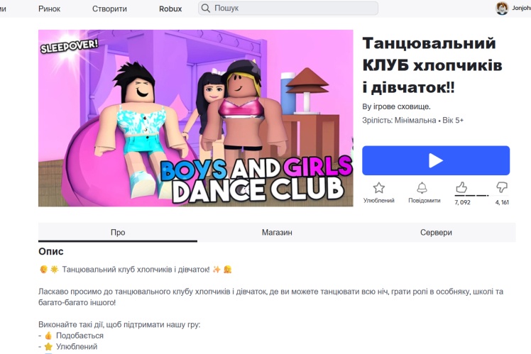 Скриншот з однієї гри, яка імітує секс-клуб, в Roblox. Гра у вільному доступі і доступна дітям від 5 років. Анастасія, зареєструвавшись під акаунтом дев’ятирічної дитини, спілкується в чаті з незнайомцями. Там обговорюють, скільки кому років. Коли один з користувачів каже «5 років», інший користувач відповідає фразою: «Опа, в самий раз».