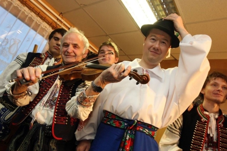 Після того, як Окамуру обрали сенатором від Злінського округу, він намагався залучити туди іноземних туристів. На фото він у традиційному костюмі виступає перед знімальними групами чотирьох найбільших японських телеканалів, 22 листопада 2012 року.