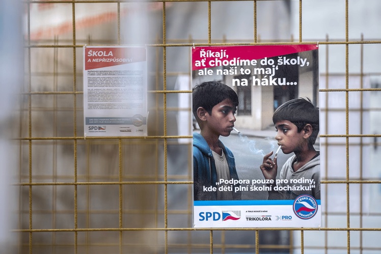 Особливо резонансною стала минулорічна рекламна кампанія SPD напередодні регіональних виборів. Партія під керівництвом Окамури розмістила білборди в центрі Праги проти міграційного пакту ЄС, на одному з яких був темношкірий чоловік у закривавленій сорочці з ножем у руці й гасло: «Недоліки в охороні здоровʼя не вирішать “хірурги” з-за кордону». Інший плакат, створений за допомогою штучного інтелекту, зображував двох ромських хлопців, що курять сигарети, з текстом: «Кажуть, нам треба ходити до школи, але нашим батькам це байдуже… Підтримка — лише сім’ям, де діти ходять до школи».