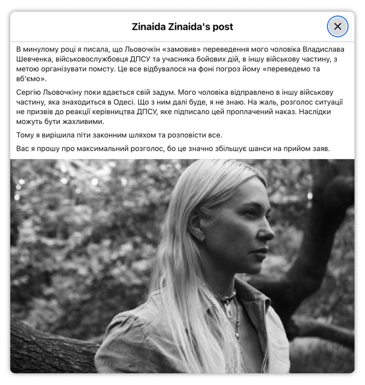 Я дуже хочу, щоб наказ про переведення Владислава анулювали. Щоб він зміг захистити свою гідність і честь як воїн. Він із цим впорається, я впевнена. А я би хотіла захистити своє життя, щоб я могла спокійно жити, творити. Я зараз на деякий час припинила заняття, не їжджу до військових у шпиталь. Я не можу проводити заняття. Я маю готуватися до виставки, присвяченої Чорнобильській катастрофі. У квітні в мене великий проєкт. Я не можу на цьому всьому зосередитись.