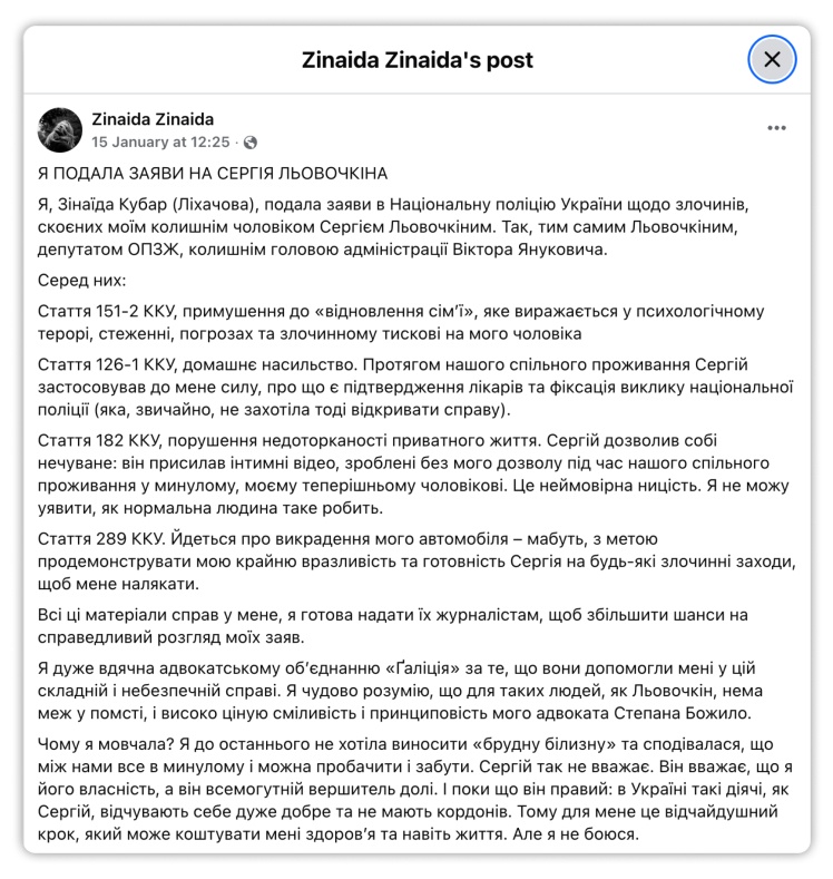 У пості ви говорите про фізичне насилля. Що у вас є докази, що ви викликали поліцію, але через певні обставини, я так розумію, через вплив Сергія, це ніде не зафіксовано. Про що мова? Він вас бив? Коли це було?
