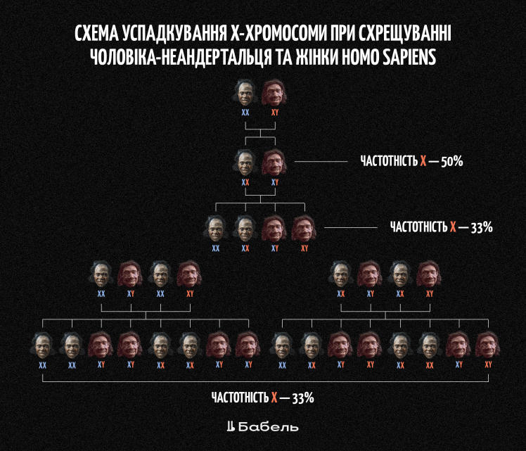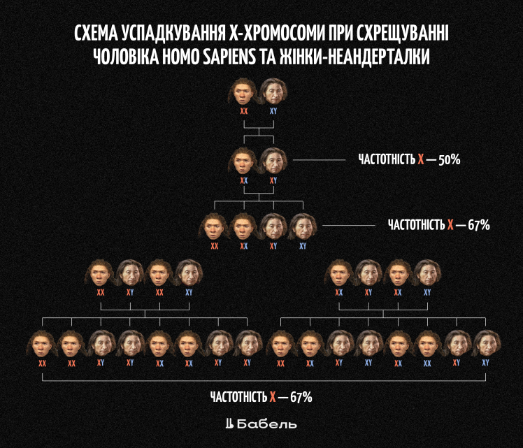 Коли гомо сапієнси й неандертальці схрещувалися, це зазвичай відбувалося між чоловіками-неандертальцями та жінками-людьми. У результаті діти, що народжувалися від таких пар, отримували одну Х-хромосому від матері, тобто від людини. Тому більшість Х-хромосом у цих дітей була людською, а не неандертальською.