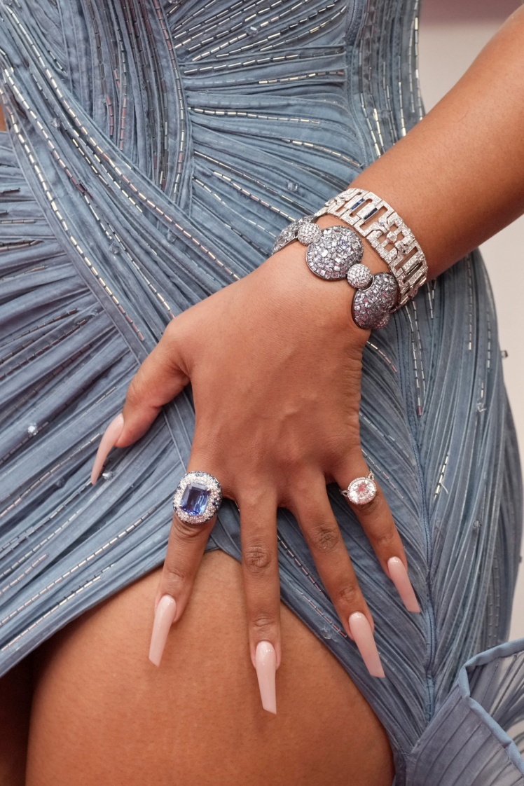 Зендая відмовилася від намиста, обравши сережки-підвіски, браслет і каблучку Bulgari, оздоблені темно-рожевими морганітами та золотом, які гармонійно завершували образ.