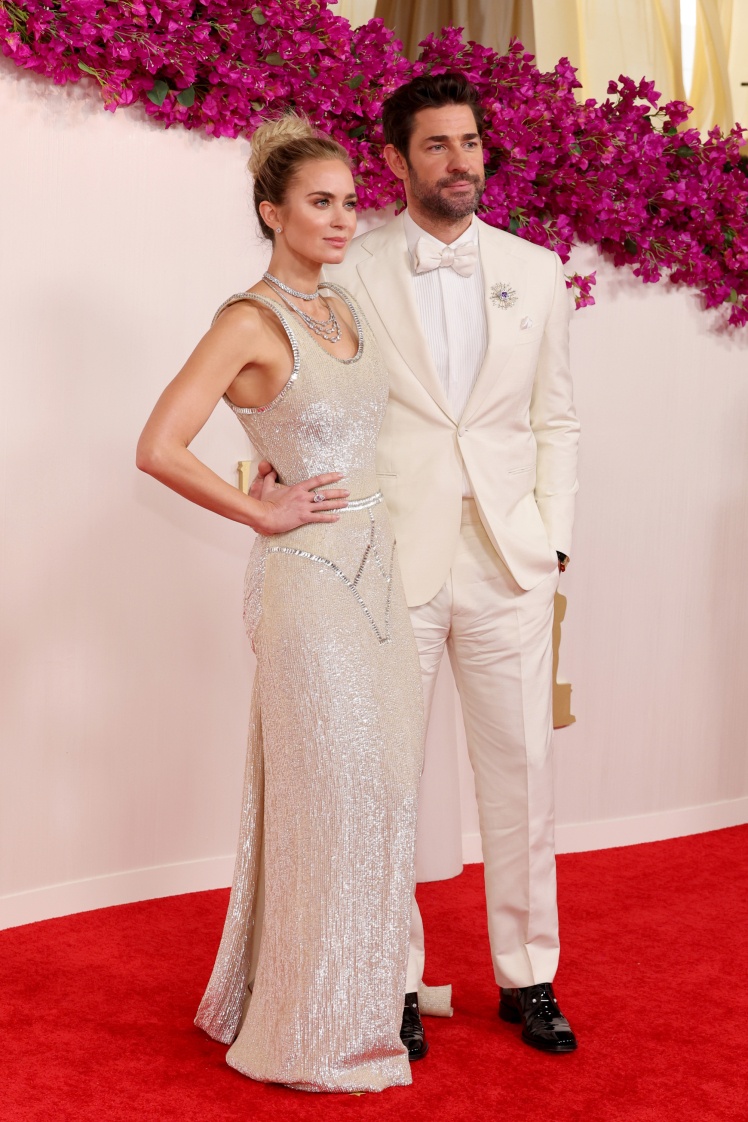 Чоловік Емілі Джон Красінський доповнював її образ — молочний смокінг із шовковою краваткою-метеликом, білосніжна сорочка та блискучі чорні туфлі.