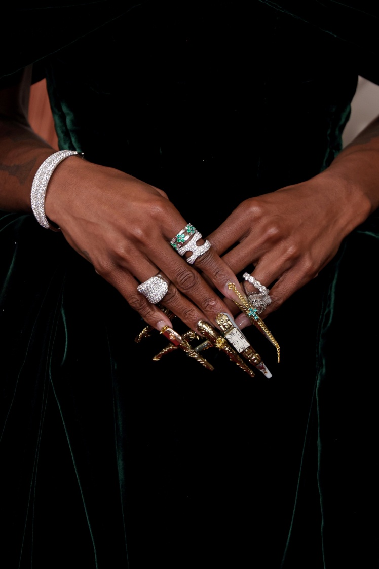 Співачка гордо йшла червоною доріжкою у вбранні від французького модного дому Alaïa. Шкіряна сукня кольору темного шоколаду з довгим шлейфом, прозорими вставками та вирізами на стегнах щільно обтискала фігуру. Образ доповнювали високий пучок, насичена червона помада, атласні босоніжки Giuseppe Zanotti, смарагдово-золоті сережки-підвіски Moussaieff Jewellers і масивні каблучки.
