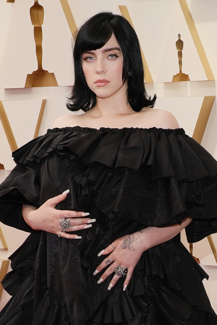 На червону доріжку «Оскару-2022» Біллі прийшла в готичному образі. Обʼємна багатоярусна чорна сукня в її (тоді ще звичному) оверсайз-стилі, але з відкритими плечима. Цю сукню створив італійський дім моди Gucci під керівництвом модельєра Алессандро Мікеле. Образ доповнили масивні високі чоботи на платформі, а довершили діамантові каблучки у формі зірок і сережки бренду антикварних прикрас Fred Leighton. Волосся пряме, трішки підкручене на кінцях — невеличкий ретро-акцент. І майже без макіяжу.
