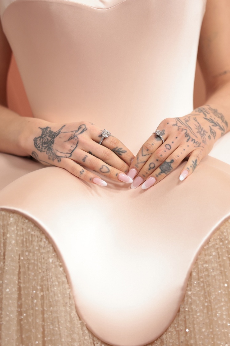 На церемонії зірка «Оппенгеймера» Емілі Блант з’явилася в мерехтливій світло-золотавій бісерній сукні з кутюрної колекції Schiaparelli весна/літо 2024 року. Пошив її Деніел Роузберрі, відомий своєю любовʼю до візуальної омани, — сукня кольору шампанського була ніби «підвішена». Її декольте і пройми, оздоблені прозорими кристалами, надавали верху каркасності — бретелі не лягали на плечі, ніби рухаючись довкола.