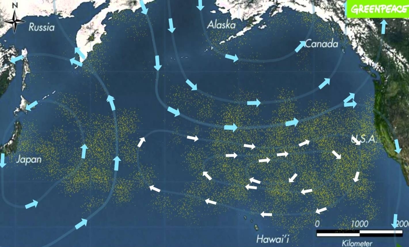 Сміття зазвичай скупчується там, де сходяться течії та немає сильного вітру. Найбільше таке скупчення — Велика тихоокеанська сміттєва пляма (GPGP). Вона покриває 1,6 мільйона квадратних кілометрів — це вдвічі більше за площу України. Проте пляма складається не тільки з пластику. Половина — це рибальські сітки, а ще 20% — те, що було змите під час Японського цунамі в 2011 році.