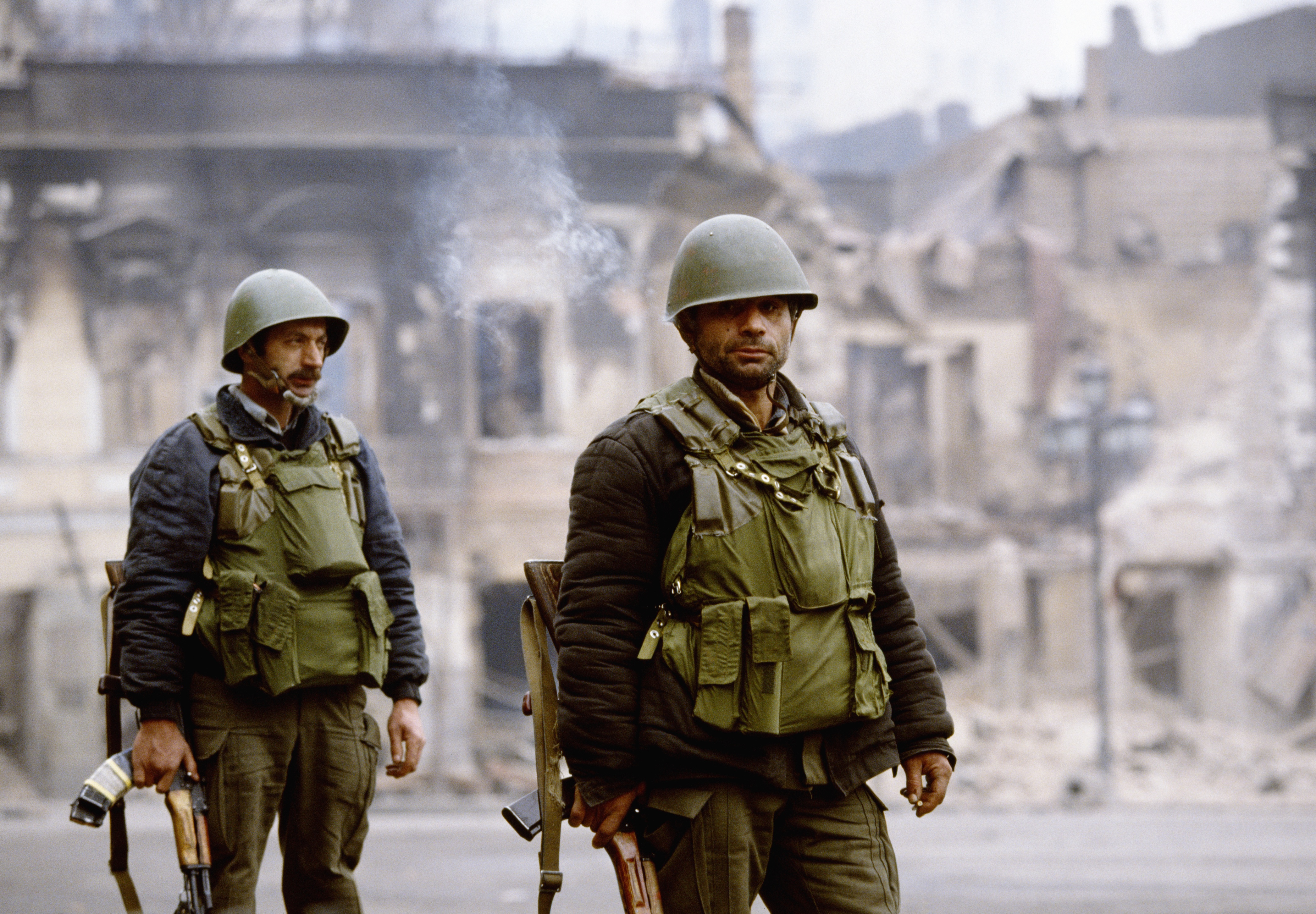 Президент Грузії Звіад Гамсахурдіа сидить за столом у будівлі парламенту в Тбілісі, де він сховався під час громадянських заворушень. Двоє грузинських солдатів стоять серед зруйнованих бомбами будівель у Тбілісі під час громадянської війни в Грузії.