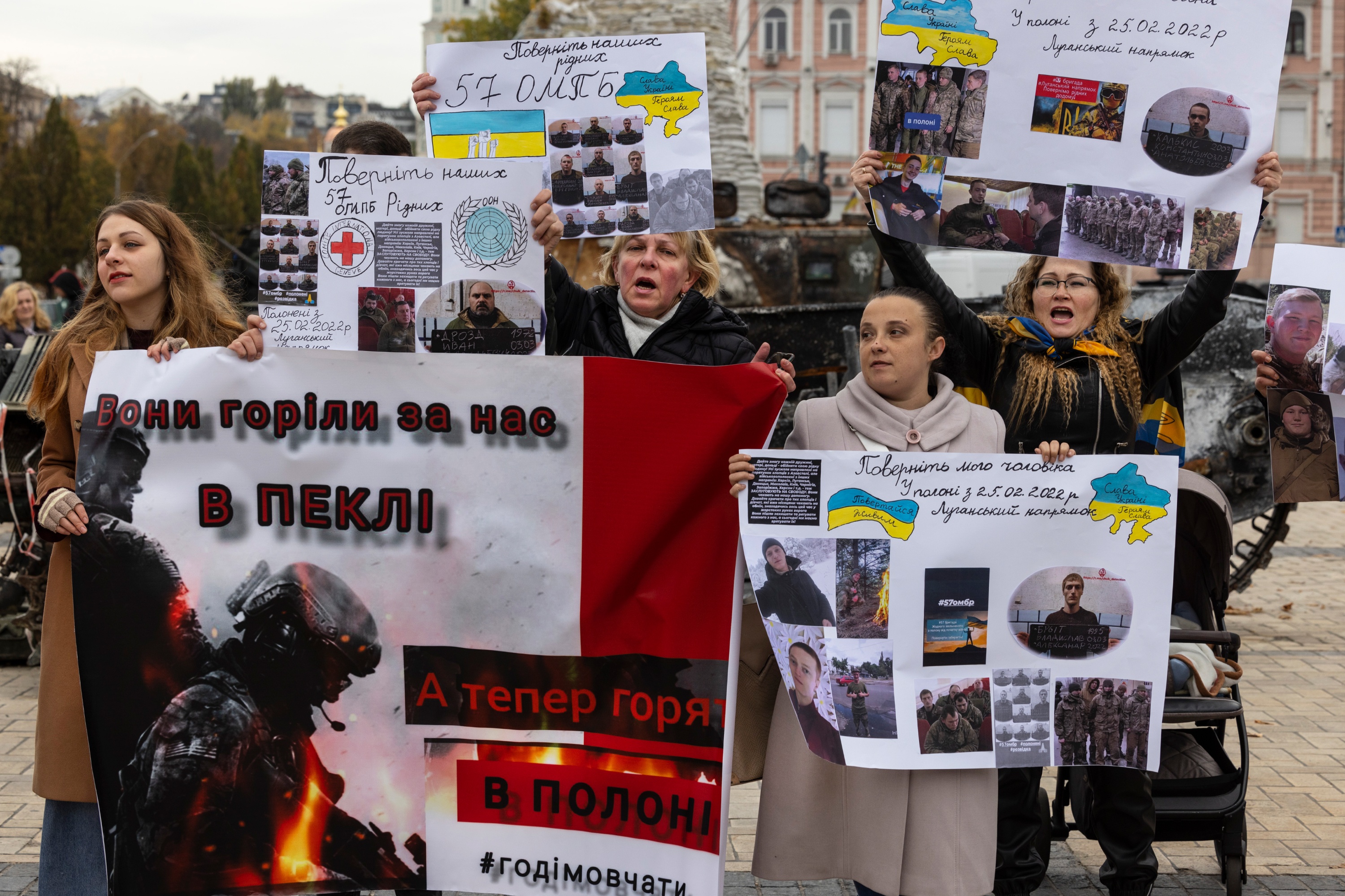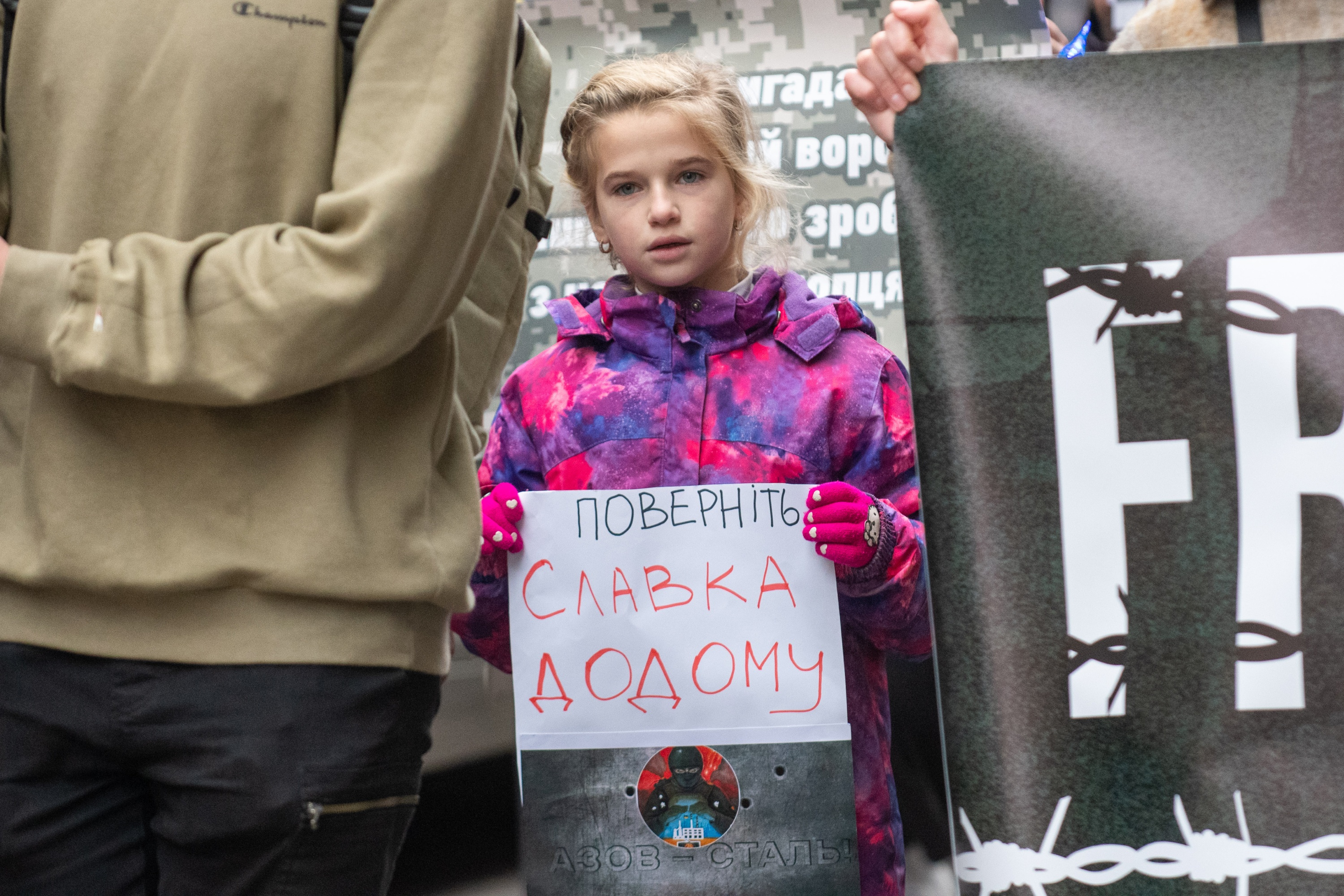 Протестувальники збираються з вимогою репатріації військовополонених з Маріуполя та інших окупованих росією територій 22 жовтня 2022 року в Києві. Дівчина тримає плакат із написом «Поверніть Славка додому» під час акції 5 листопада 2022 року у Львові.